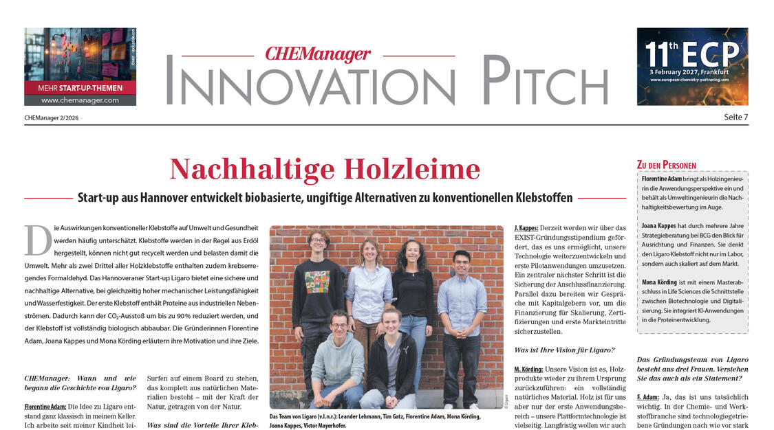 So begann die Suche nach einer Alternative zu den vielen umweltschädlichen Klebstoffen, die heute in Möbeln, Verpackungen oder Baustoffen stecken. Aus ersten Experimenten im Labor entstand die Idee zu LIGARO – einem Leim, der stark hält, aber sauber bleibt: biobasiert, ungiftig und vollständig fossilfrei.Inzwischen arbeitet unser interdisziplinäres Team daran, die Rezeptur weiterzuentwickeln und marktreif zu machen.